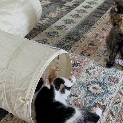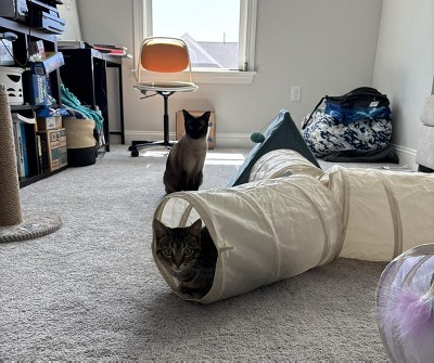 My cats love this toy! It is their favorite tunnel! My dog walks by the tunnel and one of my cats will pounce next to my dog and they will start playing and when my cat wants to hide he will run into the tunnel again and pounce. It’s the funniest and cutest ever! I only bought it because my cousin bought it for her cat and her cat also loves it! Both my cats love playing together in the tunnels too! I don’t have many pictures of my cats playing since I am enjoying watching them play. I do switch their toys around also. When I travel, I leave all their toys out so they have a lot of stimulation and not be bored.