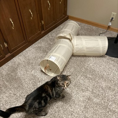 At first, my cat was a little scared of it, but now she likes to run straight through it. She’s not a fan of the three-way tunnel, but we bought a two-way tunnel from Target previously so I would recommend that one instead!