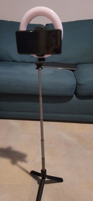 This is a great tripod and ring light. My kids love to make videos of themselves and they were so excited to start using this. It was very easy to pair with the phones and is really easy to manipulate into different positions. The 3 levels of light on each color is really nice to have compared to just one bright light. The included remote is also a nice touch and makes use very easy.