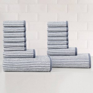Enhance your bathroom with the luxury, quality, and absorbency of the Truly Soft 16-Piece 100% Cotton Yarn Dye Stripe Bath Towel Set. Includes: two bath towels 27 by 52 inches, two hand towels 16 by 26 inches, and twelve wash cloths 12 by 12 inches. All items in this towel set are made from 100% cotton, 400 GSM terry cloth.