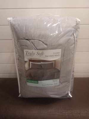 [This review was collected as part of a promotion.] The Truly Soft Crinkle Garment 3 Piece Comforter Set is large and comfortable. The set is packaged in a thick plastic zippered bag that can be reused. I found the fabric to be soft and the texture adds style, both the comforter and shams are made with the same fabric. On all three pieces one side is crinkle textured and the other side is smooth, so the comforter is reversible. The shams have the opening for the pillows in the middle instead of on the end, this makes it easy to insert pillows. This set is light gray, which will go with many other designs. One thing I noticed is that after washing and drying the comforter, the material did show wrinkling throughout. The set did remain fluffy and soft after washing and drying. Overall, I found the comforter comfy and fit nicely on my queen size bed.