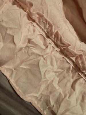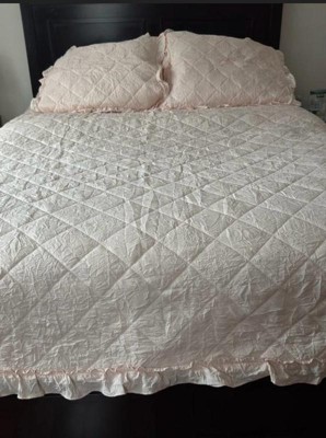 [This review was collected as part of a promotion.] Loving the Truly Soft Crinkle Ruffle 3 piece set in the color Blush. First off, it’s super soft, more than I expected it to be. The crinkle pattern in pictures made me think it might be a bit rough or scratchy, but it's not at all! The texture is so light and soft and just really cozy. It's very breathable, making this perfect for the current in-between summer/fall weather. The color is a really pretty light blush, and the little crinkle design is actually adorable, it looks clean and stylish. I have a full size bed, and the quilt is a bit big for it, which makes sense since this is for full/queen. Overall, this is 10 for me, for the texture, the breathability, and color.