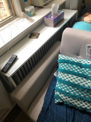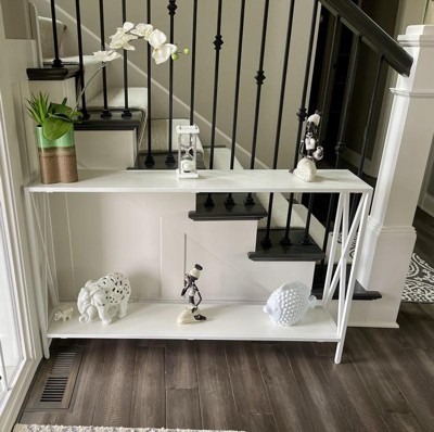 Narrow and lightweight console table. Easy enough for a single woman like me to carry it up my apartment stairs and put it together myself. I ordered the white and am using it as a sort of DIY radiator cover/table top. It took me a while to find the right console table with the correct dimensions to fit in my tiny space. This table was the perfect length and height and my radiator fits inside and the top shelf provides another surface. The table is also narrow and light enough I’ll probably take it with me when I move.