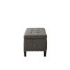 - Description This modern storage ottoman accentuated with button tufting provides ample storage and features an elegant grey linen fabric with black noir legs. Assembly required. Product Details See below 1 Bench:42W x 18D x18Din Internal Size:38inW x 13.75inD x 9.5inH Item Weight /LB:25.9 Floor to Seat Height:18in Weight Capacity:400 lbs Material Frame Composition: Select Hardwoods and Plywood, Birch wood legs Legs/Finish: Black Noir Wood Fabric Composition: 100% Polyester Cushion: High Density Foam Additional Features: Interior Storage / Individually Placed, Silver Nail Heads