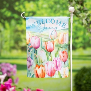 This charming flag adds an extra special touch to any home. Features lively colors and attractive Tulip Fields design. Flag is crafted of medium-weight suede fabric made from recycled plastic that provides a soft and durable texture. Artwork is heat transferred onto the sun-blocking material so that it is easily viewed from both sides. The weatherproof flag will not fray or fade with continued outdoor use. This flag features a sleeve for use with any standard flagpole or stand, sold separately.