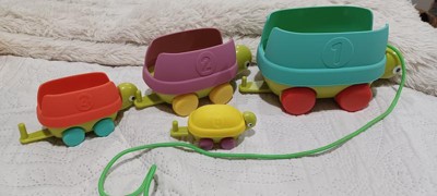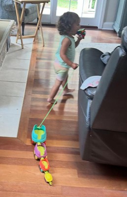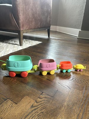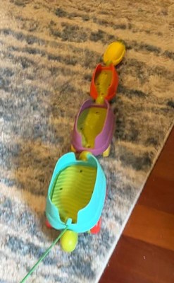 This turtle pull along toy is great. You can pull them stacked or pull one behind the other kinda like those toy trains for toddlers back in the day. It is fun vibrant colors made of plastic and rubber.