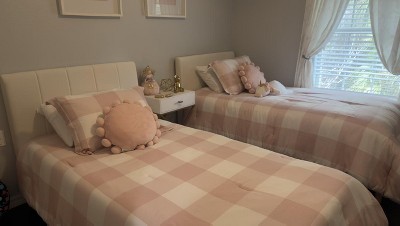 The Room Essentials Twin Bed comes in a beautiful cream color, with a headboard wrapped in an upholstered fabric. My daughter loves it and I like that it’s lower to the floor so it’s easier for her to get in and out of bed.