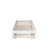 - Included Twin-size trundle rolls easily on wheels and accommodates up to an 8" twin size mattress
