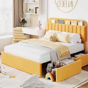 Twin/Full Bed Frame with Storage Headboard and 2 Drawers, Upholstered Platform Bed with Bookcase, No Box Spring Needed, Yellow