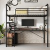 Transform any room with this versatile twin loft bed that combines sleeping, working, and storage solutions in one compact unit. The sturdy metal frame features an elevated twin bed with safety guardrails and a spacious L-shaped desk underneath, perfect for studying, working, or gaming. Built with heavy-duty steel construction that supports up to 400 lbs, this loft bed offers quiet, reliable performance without requiring a box spring.The design includes practical storage solutions with open shelves and decorative metal mesh panels that can be customized with hooks or photos. Available in vintage and black finishes to match various decor styles. Ideal for kids' rooms, teen bedrooms, college dorms, studio apartments, and guest rooms where space optimization is essential. Assembly is straightforward with included instructions and hardware. Mattress not included.