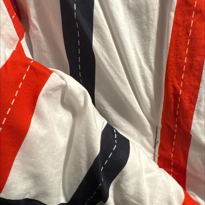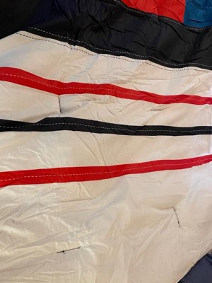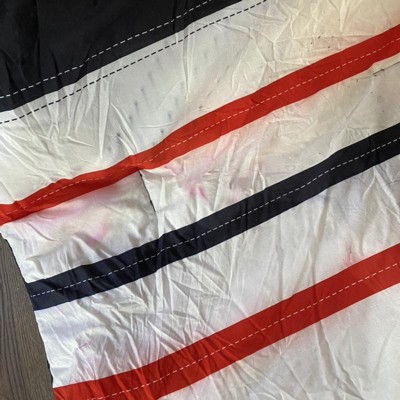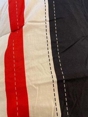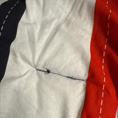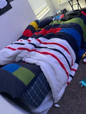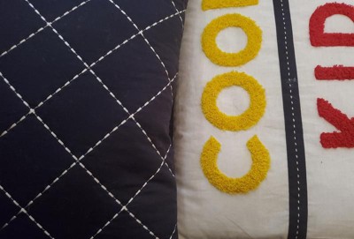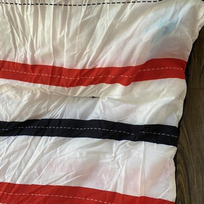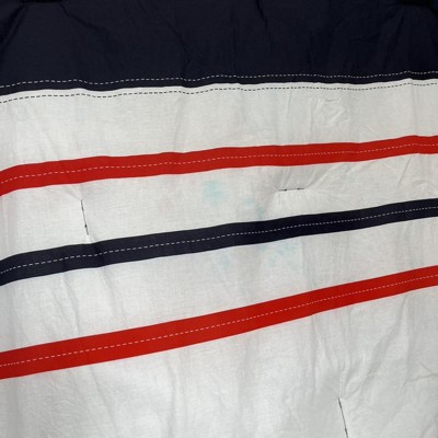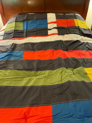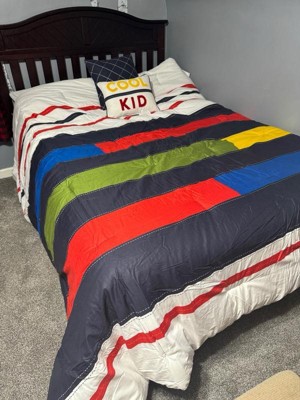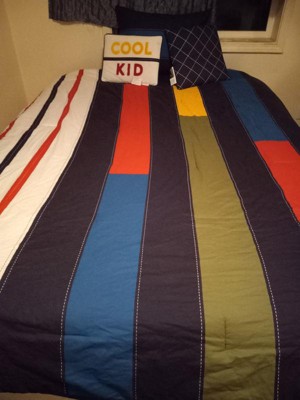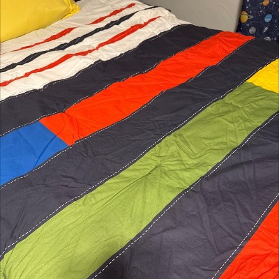 [This review was collected as part of a promotion.] This set has nice bright colors, a sort of nautical look to the pieces. Pictured on a queen size bed, a good size, as it hangs over enough but not too much. The decorative stitching is printed on, which is not my favorite detail. The stitching to keep fill in place is all contrasting colors, which makes it looks inexpensive. Bonus is that it’s all cotton, which can be difficult to find. I think it’s a great set for a boys room-a design that could span a number of age groups.