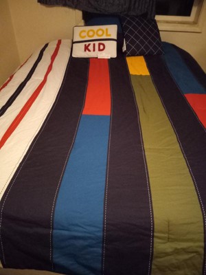 [This review was collected as part of a promotion.] I got this for my elementary aged son's room. He thought it was awesome and he especially loved the "Cool Kid" pillow that came with the set. The quality is pretty good, not luxurious but not cheap feeling. It was a good value. I especially love the color blocking because it gives him an opportunity to transition into an older boys room more easily;)
