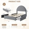 Enhance your bedroom with this modern Twin size bed frame featuring a unique round headboard and soft boucle upholstery. The platform is equipped with spacious drawers for flexible storage, while robust wooden slats and a reinforced frame ensure quiet, reliable support. Easy assembly makes setup quick and hassle-free.