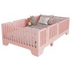 Meet a playful twist on your child's sleep space with this charming floor bed! Designed with a whimsical fence and special small door, this bed brings both safety and adventure to your little one’s bedroom. Its low, ground-hugging profile creates a secure zone where kids can rest and play freely, while the removable door encourages independence—letting them climb in and out on their own. Beyond its delightful look, this full-size floor bed supports a smooth transition from crib to big-kid bed, fostering growth and self-reliance. Crafted from durable MDF and reinforced with sturdy plywood slats, it promises lasting stability and reliable support night after night. Practical and fun, the bed arrives in one box with simple instructions, making setup quick and straightforward. Offering a safe, engaging spot for sleep and imagination, this floor bed is the perfect companion for your child’s early years.