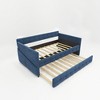 - This stylish daybed with a convenient trundle bed is upholstered in sumptuous, plush velvet fabric. The high-end velvet not only enhances the aesthetic appeal with its rich texture and sheen but also provides exceptional comfort and long-lasting durability. Ideal for modern interiors seeking both functionality and luxury.
