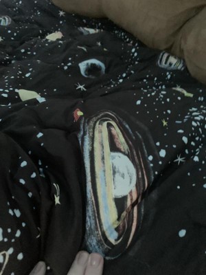 Adorable space themed, 2 piece comforter set. The kid loves it, especially the glow in the dark feature. Its not a very bright glow. The comforter is true to size, has a good weight and soft texture and reversible.