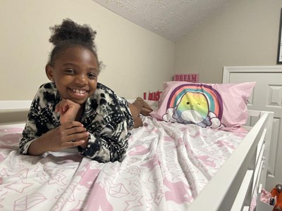 What cute themed sheet set with deep pockets so it doesn’t ride up when my little one moves about. The design is cute and totally on theme for her squish-mallow obsession. It’s soft to the touch and after the first wash the colors haven’t faded .