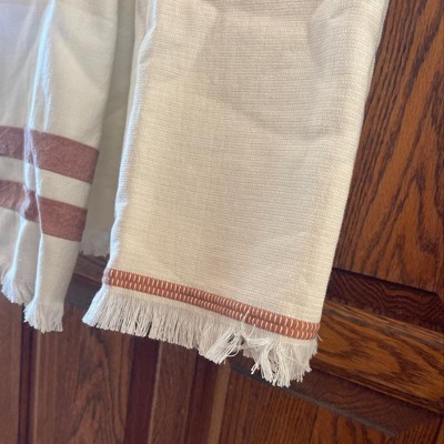 Meet your everyday needs in simple style with the Twin Stripe Cotton Hand Towel from Hearth & Hand™ with Magnolia. This beige hand towel features twin stripes in orange hues for a contrasting look that complements your existing decor and is adorned with fringe to elevate the look. Made with 100% cotton fabric, this lightweight hand towel feels soft and is great for wiping hands or performing cleaning tasks.