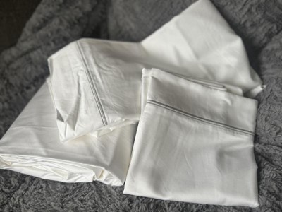Beautiful and so soft Threshold Hotel Sateen Sheet Set. 800 thread count makes this sheet set so nice. The set is soft like butter and feels great. It comes with a fitted sheet that can accommodate up to an 18 inch mattress, a flat sheet and 2 pillowcases. Love the subtle detailing on the fitted sheet and pillowcase.