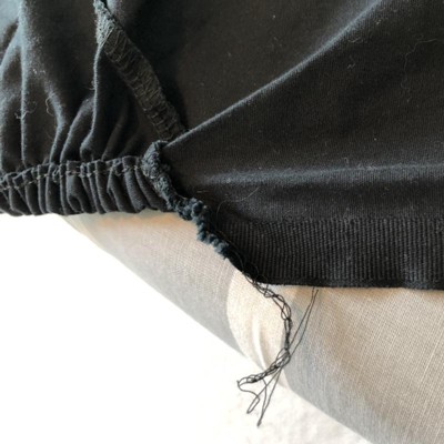 We ordered these sheets in black for a twin-sized mattress. When they arrived my husband promptly washed them because we needed them immediately. I put the sheets on the bed and I noticed three things 1) the material is soft texture and good quality, 2) the elastic runs the length of the fitted twin sheet instead off the ends, and 3) the ends of material are not hemmed. What the heck? The material along the short ends is un-hemmed; the stitching for the elastic stops and the serge stitching from the boxed corner just runs to the edge. The only good thing I can say about the unfinished edge is that it is a selvage edge so it won’t ravel, but this is not good craftsmanship. This item is not sold in stores so I can’t process a quick return. And since I need the sheets now, I guess I’ll be stitching up the ends myself.