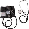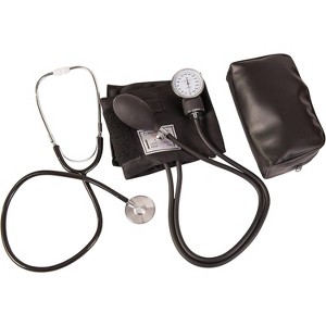 Two Professional Quality Blood Pressure Monitoring Tools in 1 Convenient Kit. The HealthSmart Home Blood Pressure Kit comes complete with a sphygmomanometer and nurse stethoscope. This convenient kit is perfect for home use because it allows easy monitoring by an individual or assistance from another person. Record accurate results with the easy-to-use manual inflate and deflate design. The sphygmomanometer features an easy squeeze inflation bulb that comfortably fits in your hand. The aneroid gauge shows large easy-to-read numbers, perfect for those with poor vision. You can also listen to a clear-sounding heartbeat with this top quality nursing stethoscope. It comes with comfortable, firm ear tips that add extra cushioning to your ears. The convenient carrying case is ideal for doctors, nurses, EMTs, other medical professionals and students! Contains: Syphygmomanometer, inflation bulb, aneroid gauge, 22inch stethoscope, adult sized arm cuff fitting arm circumfrences of 10 to 14 inches, and zippered carrying case.