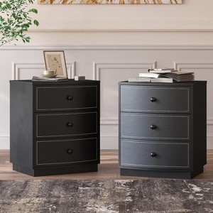 Elevate your home decor with our sleek Black 3 Drawers Nightstand Set of 2. Perfectly designed to fit seamlessly into any room, these modern curved bedside tables combine functionality and style. Crafted with a sturdy solid wood frame and high-quality faux leather panels, they offer a sophisticated look that complements both contemporary and classic interiors. Each nightstand features three spacious drawers, providing ample storage space for your essentials, from books to personal items. The robust construction ensures durability, while the metal sliding tracks guarantee a quiet and smooth drawer operation, making it easier than ever to access your belongings without disturbing your peace. Ideal for bedrooms, living rooms, or offices, this nightstand set is not only easy to maintain but also adds a touch of elegance to your space. Upgrade your home organization with this stylish and practical nightstand set today!