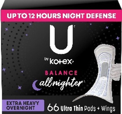 Enjoy the overnight period pad with the most coverage of nighttime ultrathin pads with U by Kotex Balance Extra Heavy Overnight Pads with Wings. Our extra heavy absorbency pads help to prevent leaks and provide up to 12 hours of night defense. Each extra heavy overnight feminine pad has a larger front and 80% larger back** and provides up to zero front, side or back leaks. Additionally, our pads with wings are designed with a raised center that absorbs 2x faster.* The raised center absorbs quickly for up to 100% leak free protection and helps to lock away blood, sweat and odor. On top of that, our menstrual pads are dermatologist-tested to be gentle on skin. They pads are made without fragrance, lotions, pesticides, parabens, elemental chlorine and natural rubber latex. To help you sleep soundly, our nighttime period pads provide up to 12 hours of night defense. Designed to fit your body’s curves, our extra heavy overnight pads with wings help eliminate gaps and prevent leaks while providing outstanding skin comfort to help you sleep soundly. Each overnight pad with wings is individually folded and wrapped to protect your pad with easy, convenient access. For excellent daytime protection, try U by Kotex Balance Ultra Thin Pads. U by Kotex feminine pads are FSA/HSA/HRA-eligible in the US. Packaging may vary from images shown. (*vs. the leading unscented foam pad) (**vs. U by Kotex Balance Regular Absorbency Pads)