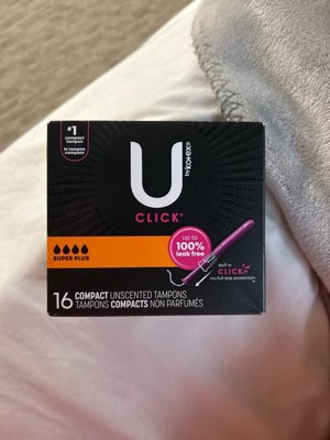 Get up to 100% leak-free with the #1 compact tampon, U by Kotex Click tampons move with you for outstanding comfort and are MADE WITHOUT fragrance. Our tampons are gynecologist tested & made without fragrance, pesticides, BPA and elemental chlorine rayon. These tampons are compact to fit in your purse or pocket on the go. To use, pull until you hear the click for full-size protection in one easy step. U by Kotex tampons for women are individually wrapped in vibrant colors and patterns inspired by the latest fashion trends. Click compact tampons are available in regular, super and super plus absorbencies. U by Kotex Click tampons are FSA, HSA, HRA-eligible in the U.S.