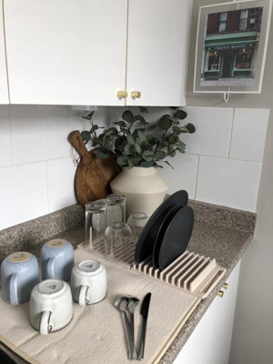 This is my second Drying Mat but I didn’t have the peg system or drying rack which I LOVE. What a great duo! I love that rack allows me to have more items on the mat and frees up space or layering boards or plates on top of one another. So functional, so easy. I can’t recommend this enough! I also love the linen colour. It is more on the beige side but works with white and grey tones if you have brass / warm tones in the space too.