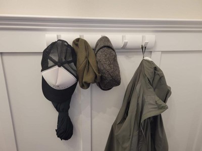 Saw this item at a church. They had about 8 of these in a row all mounted on a 2 - 2 1/2 " board to extend it out away from the wall, maybe to allow thicker coats to hang without falling off. They look very European and minimal style. Very nice. They used the Oak finish, as we did also.