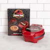 Uncanny Brands Jurassic Park Waffle Maker - T-Rex on Your Waffles - Waffle Iron. Jurassic Park enters in your kitchen with this striking, full-color waffle maker. Detailed, die-cast aluminum plates on the inside are easy to clean and make a perfect impression of T-Rex's iconic logo every time. Pour in batter, eggs, brownies, shredded potatoes, or whatever strikes your fancy. Dual indicator lights tell you when its time to pour batter and when your waffles are cooked. Be a superhero at every meal.