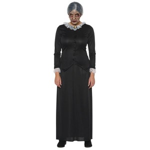 • IGNITE NOSTALGIA: Reminisce on cherished childhood memories by reviving beloved characters from your favorite cartoons, comics, or nostalgic TV shows, rekindling the magic and igniting nostalgia in the hearts of those who see you.br • TIME TRAVEL TO THE PAST: Transport yourself to a bygone era with vintage-inspired adult costumes, stepping into the shoes of a glamorous flapper, a dashing pirate, or a noble Victorian lady, adding a touch of history to your Halloween soirée.br • CELEBRATE AND ENJOY HALLOWEEN: Above all, adult costumes allow you to fully immerse yourself in the Halloween spirit, embracing the traditions, celebrations, and festivities associated with this beloved holiday.br br Product Description:br Great for evil old ladies and other great characters! Black full-length dress with look of button-up top and skirt with lace around collar and sleeves and attached cameo on collar. Wig glasses and shoes not included.