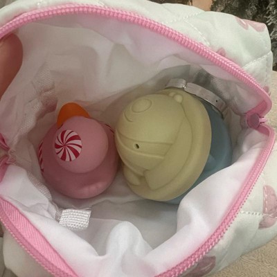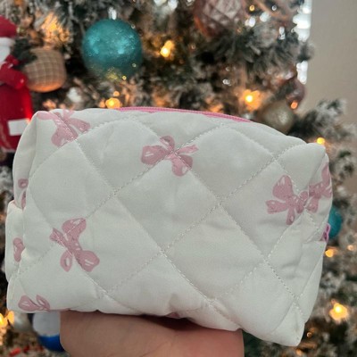 [This review was collected as part of a promotion.] This bag is smaller than expected but it’s very cute! So cute that my toddler stole it from me as soon as I took it out the package. It’s faux quilted but has a trendy pink bow pattern. It is small but great for some makeup or little trinkets. See picture for size comparison. Cute but again small bag!