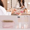 - The top zipper closure provides a wide opening for easy retrieval of cosmetics