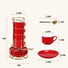 Feature:This espresso cups set of 4 includes everything you need for serving espresso: four 3-ounce cups, four matching saucers, four spoons, and a sleek stand for organized storage and a modern presentation. The stackable espresso cups are designed to be neatly stacked together, saving valuable space in your kitchen cabinet while the included stand offers a stylish countertop storage solution. Crafted from ceramic, these demitasse espresso cups resist chipping and cracking, and they are glazed to provide a smooth finish that is also easy cleaning. The classic espresso shot cups size and shape are suited for use under most espresso machine portafilters, allowing you to pull shots directly into them without splashing or mess. Featuring a minimalist design with a curved handle and a balanced spoon, this cup and saucer set enhances your coffee experience and makes for a thoughtful gift for housewarmings or birthdays. Specification: Material: Ceramic, Iron, Stainless Steel. Package List: 1 Set Espresso Cups. NOTE: Carefully handwash the metal stand and spoons to maintain their finish and prevent water spots.