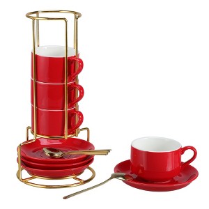 - A complete espresso set with four cups, saucers, spoons, and a sleek storage stand