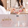 - Main compartment accommodates skincare and makeup, while side pockets organize essentials
