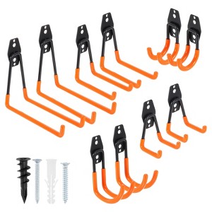 The hooks are made of thick iron with a non-slip, dipped coating to prevent scratches. The sturdy design provides good load-bearing capacity, allowing the garage hooks to hold many kinds of tools. These hooks can hang various items in your garage, garden, shop, basement, or warehouse, saving valuable floor space to keep the interior tidy. Easy installation with provided screws and anchors makes it a good option for safely and efficiently hanging items from the wall. Hooks of different shapes offer a variety of choices for hanging items, firmly holding gardening tools, power tools, folding chairs, ladders, lawnmowers, bicycles, hoses, and more.