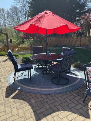 The rug works very well under a 60 inch round table and chairs on the lanai. Beautiful !