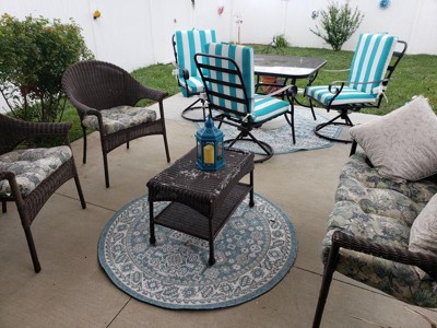 • EASY CARE: For an outdoor rug, remove debris frequently with the use of a broom or blower. To wash, spray the surface with a soap and water mixture, then rinse thoroughly with a garden hose and hang over a railing to dry thoroughly. Rotate for even wear.