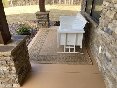 • CARE: For an outdoor rug, remove debris frequently with the use of a broom or blower. To wash, spray the surface with a soap and water mixture, then rinse thoroughly with a garden hose and hang over a railing to dry thoroughly. Rotate for even wear.