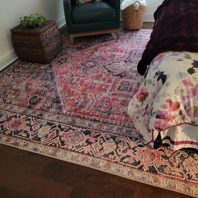The overall look of this rug works well for my space. The rug is not as bold as the color in the picture. The pictures gives off a more terra cotta red but the actual rug is more of an Americana red, navy, and beige as the main colors. Not bad, just different than I expected. Another difference is the thickness. I know a $300 rug isn't going to be high quality but I expected more of a carpet feel and this is more of a mat. It's very thin and so far ripples easily even with a non-slip pad underneath. I'm hoping that over time it relaxes a bit and doesn't pucker as much. Overall I like it for the price but definitely a budget option.