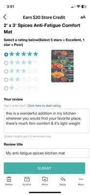 This mat is perfect for in front of my stove! It's vey cushy and it brightens up my kitchen