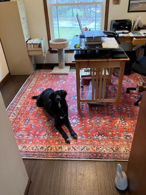 The house we bought has this ugly dark not-the-best laminate floor; very depressing. My office needed something to spiff it up, and this rug proved to be the perfect solution. (The dog thinks so, too.)
