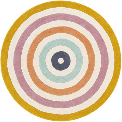 A: The rug features lightly distressed powder pinks, teals, and yellows, inspired by tropical beaches.