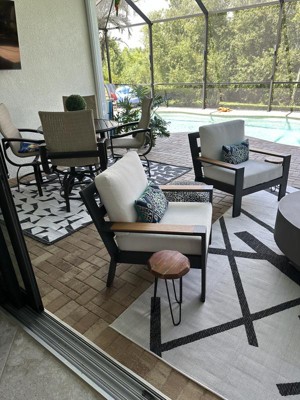 A: Yes, its flat-weave pile allows for seamless placement under furniture both indoors and outdoors.