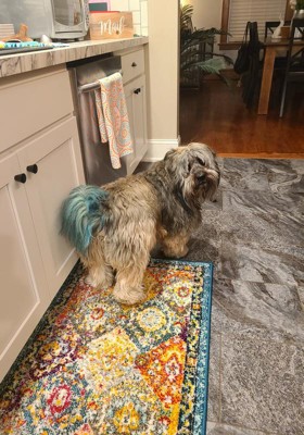 I love this rug!! I bought it for my kitchen and the multi colors really pop!!! I have received so many compliments on it already!! My dog got his tail colored teal blue and even he now matches the new rug!!! :)