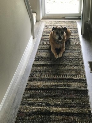 This is a beautiful, well made runner. Soft to the touch. Lovely multi color pattern hides lint, hair and dust between vacuuming sessions. Lays flat and relaxes after a couple weeks without issues. Description states that the main color of this rug is blue. I have to disagree. It is mostly dark with more black than any other color. We have it covering our existing wall to wall carpeting for extra padding. It looks lovely in our hallway.
