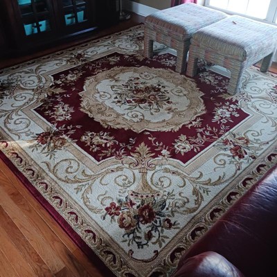 I bought this rug to put my baby grand piano on. It was perfect. It was more burgandy then the picture but I was hoping for that. I bought the slip pad to put under it and it really helped. I got it within a week and it has taken about a week for the edges to finally uncurl. Beautiful piece.
