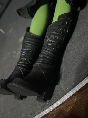 - Elphaba doll wears a soft, removable dress and features her green skin and black braided hair for endless styling!